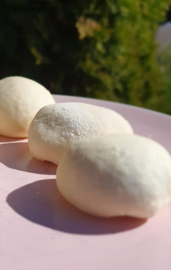 Fyll cirkeln med e hård ost eller en klick marmelad som tål värme, rulla ihop till en boll.